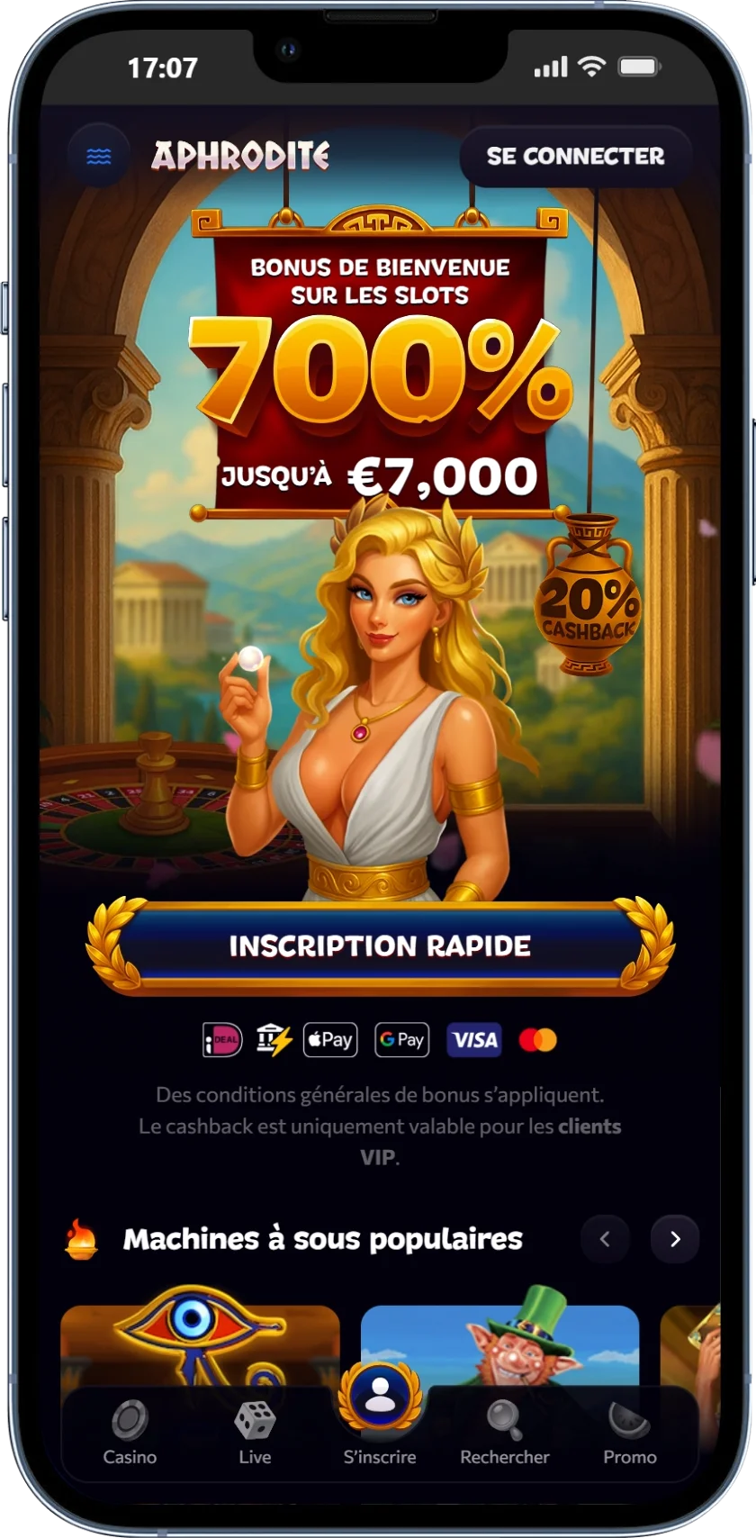 Moderne et disponible en France depuis quelques années, Aphrodite Casino est une plateforme de jeux casino dont le thème est basé sur la mythologie grecque. En effet, nous avons sur Aphrodite Casino une ludothèque de jeux de casino composée de plus de 3000 titres. Ces jeux sont conçus par des éditeurs de renom tels qu’Evolution, Betsoft, Pragmatic Play, Red Tiger, etc. Pour accompagner nos joueurs, nous avons plusieurs types de bonus dont une offre de bienvenue de 7000€ pour nos nouveaux joueurs. Ces jeux et nos fonctionnalités Aphrodite Casino en ligne sont protégés par notre licence. Cette sécurité est aussi disponible sur notre application mobile gratuite Casino Aphrodite iOS et Android.