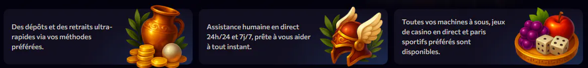 | Machines à sous | Gates of Olympus/ Book of Râ/ The Bandits/ Rainbow Richs, etc. |